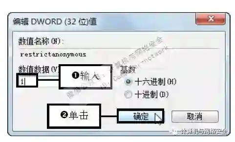 步骤3:设置restrictanonymous键值,弹出“编辑DWORD(32位)值”对话框,在“数值数据”文本框中输入“1”,单击“确定”按钮。