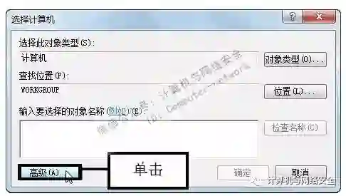 步骤3:单击“高级”按钮,弹出“选择计算机”对话框,单击“高级”按钮。