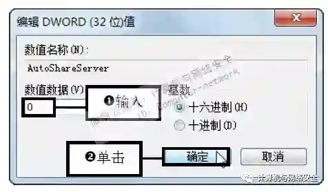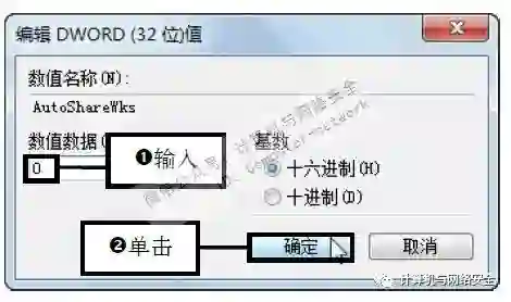 步骤6:设置AutoShareWks键值项,如果是客户机则双击打开AutoShareWks键值项,将“编辑DWORD(32位)值”对话框的“数值数据”的文本框中的数值修改为0,单击“确定”按钮保存退出。