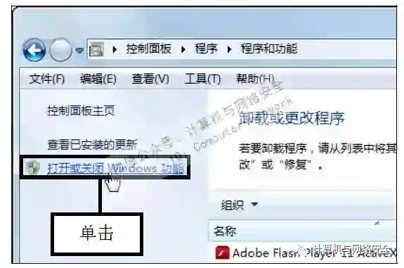 步骤2:单击“打开或关闭Windows功能”链接,打开“程序和功能”窗口,在左侧单击“打开或关闭Windows功能”链接。