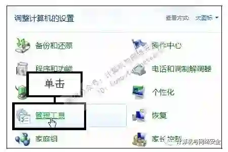 步骤2:单击“管理工具”链接,打开“控制面板”窗口,设置查看方式为“大图标”,单击“管理工具”链接。