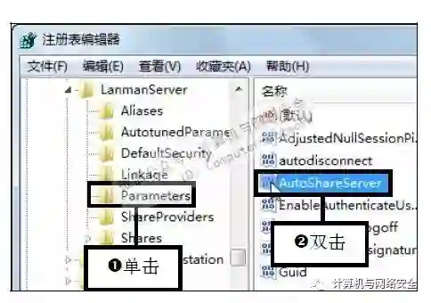 步骤4:双击AutoShareServer选项,在“注册表编辑器”左边窗格中单击HKEY_LOCAL_MACHINE\SYSTEM\CurrentControlSet\Services\LanmanServer\Parameters分支,若是服务器则双击AutoShareServer键值项。