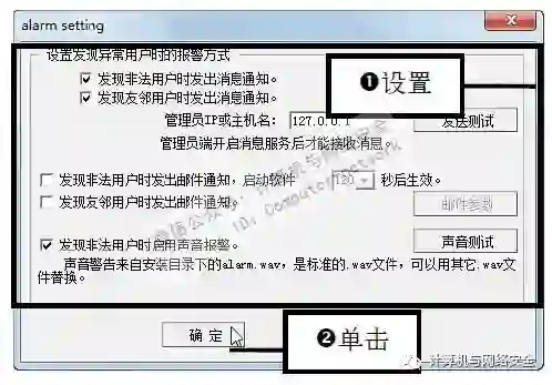 步骤4:设置发现异常用户时的报警方式,弹出"alarm setting"对话框,用户可在对话框中设置发现异常用户时的报警方式,设置后单击“确定”按钮。