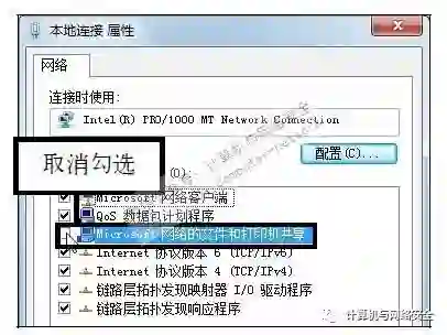 步骤4:不共享网络文件和打印机,弹出“本地连接属性”对话框,在“常规”选项卡中的列表框中取消勾选“Microsoft网络的文件和打印机共享”复选框。