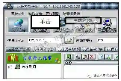 步骤2:单击“生成服务器”命令,打开“远程控制任我行”主界面,依次单击菜单栏中的“配置服务端>生成服务器”命令。