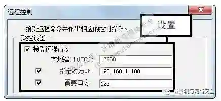 步骤14:远程受控设置,弹出“远程控制”对话框,在“受控设置”选项组中设置本地端口、对方IP地址及口令。