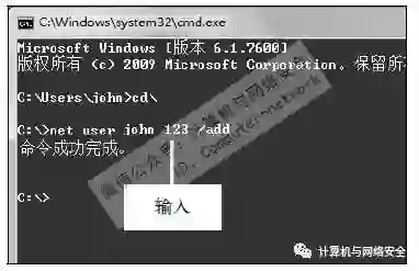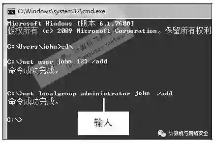 步骤10:建立账号和密码,在“命令提示符”窗口中,输入net user john 123/add命令并按【Enter】键。