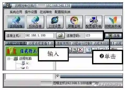 步骤7:成功连接目标计算机,输入“连接密码”和“连接端口”,然后单击“连接”按钮,连接成功后在状态栏中显示“远程主机192.168.1.100连接成功”。
