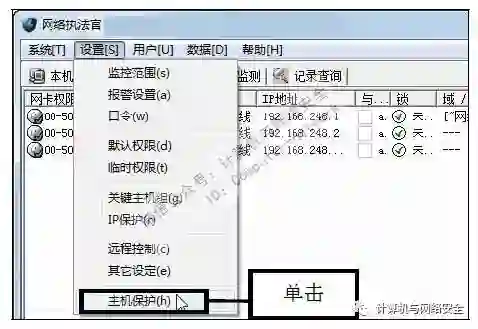 步骤17:单击“主机保护”命令,返回“网络执法官”主界面,在菜单栏中依次单击“设置>主机保护”命令。