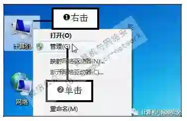 步骤2:单击“管理”命令,在桌面上右击“计算机”图标,然后在弹出的快捷菜单中单击“管理”命令。