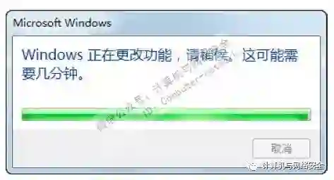 步骤4:正在关闭,弹出对话框,提示Windows正在更改功能,请稍候,耐心等待即可。