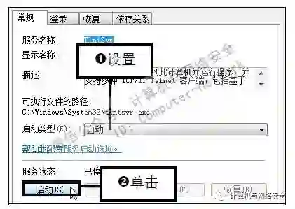 步骤7:启动Telnet服务,在弹出对话框中将“启动类型”设置为“自动”后单击“应用”按钮,然后单击“启动”按钮即可启动Telnet服务。