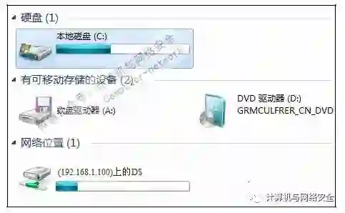 步骤6:查看映射的目标主机盘符,映射成功后打开“计算机”窗口,可在该窗口中看到“ssmissnn(192.168.1.100)上的D$”盘符,该磁盘就是目标主机上的D盘。