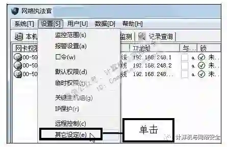 步骤13:单击“远程控制”命令,返回“网络执法官”主界面,在菜单栏中依次单击“设置>远程控制”命令。