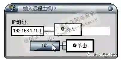 步骤3:输入目标计算机的IP地址,在“输入远程主机IP”对话框的“IP地址”文本框中输入目标计算机的IP地址,然后单击OK按钮。