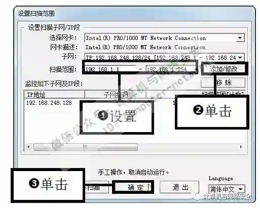 步骤2:设置扫描的IP地址范围,弹出“设置扫描范围”对话框,设置扫描的IP地址范围,单击“添加/修改”按钮,然后单击“确定”按钮。