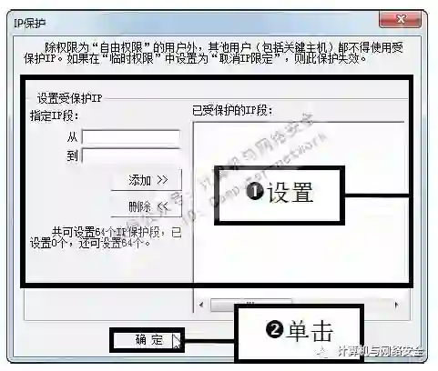 步骤12:设置保护的指定IP段,弹出“IP保护”对话框,设置保护的指定IP段(目的是保护一定范围内的IP不被普通权限的用户所使用),单击“确定”按钮。