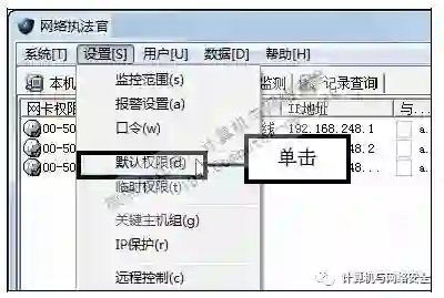 步骤7:单击“默认权限”命令,返回“网络执法官”主界面,在菜单栏中依次单击“设置>默认权限”命令。