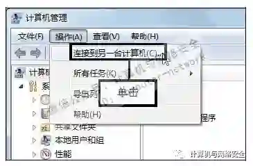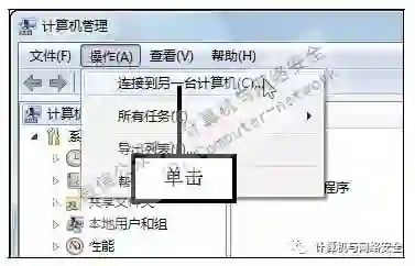 步骤9:单击“连接到另一台计算机”命令,打开“计算机管理”窗口,在菜单栏中依次单击“操作>连接到另一台计算机”命令。