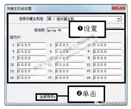 步骤10:设置关键主机组,弹出“关键主机组设置”对话框,首先选择主机组,然后设置组名称,最后设置组内IP,单击“全部保存”按钮。