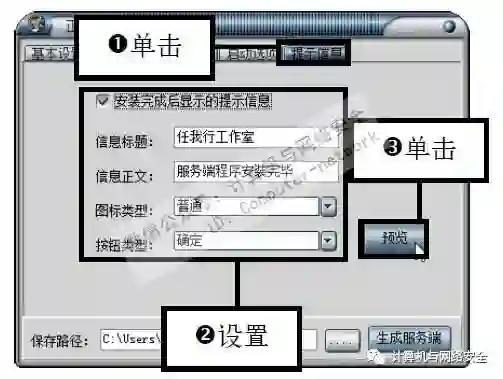 步骤9:设置提示信息,切换至“提示信息”选项卡,勾选“安装完成后显示的提示信息”复选框,然后设置提示内容,设置后单击“预览”按钮。