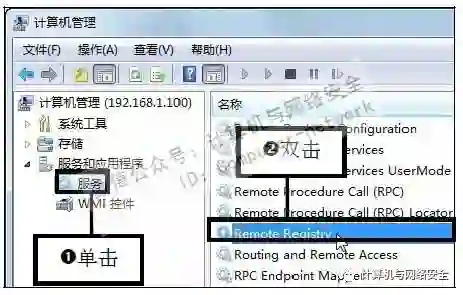 步骤11:双击Remote Registry选项,此时“计算机管理”目录后面就会出现目标主机的IP地址,在左边窗格中依次单击“服务和应用程序>服务”选项,然后在右侧窗格中双击Remote Registry选项。