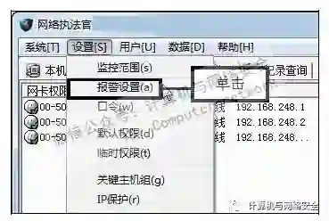 步骤3:单击“报警设置”命令,打开“网络执法官”主界面,在菜单栏中依次单击“设置>报警设置”命令。
