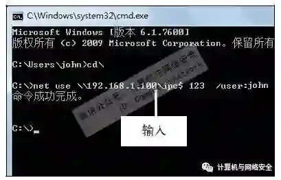 步骤8:建立IPC$连接,打开“命令提示符”窗口中,输入net use\\192.168.1.100\ipc$123/user:john命令,然后按【Enter】键。