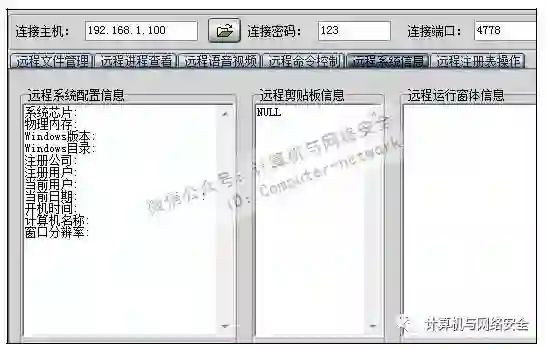 步骤16:查看目标计算机的系统信息,切换至“远程系统信息”选项卡,可看到“远程系统配置信息”、“远程剪贴板信息”、“远程运行窗体信息”3个窗口。