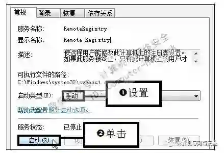 步骤12:启用Remote Registry服务,在弹出的对话框中将“启动类型”设置为“手动”,单击“应用”按钮后再单击“启动”按钮,启用Remote Registry服务。