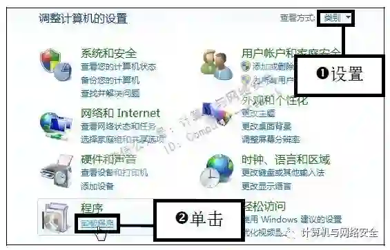 步骤1:单击“卸载程序”链接,打开“控制面板”窗口,设置查看类型为“类别”,然后单击“程序”下方的“卸载程序”链接。