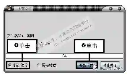 步骤11:选择断点续传模式,弹出“下载文件”对话框,单击选中“断点续传”单选按钮,单击“开始下载”按钮。