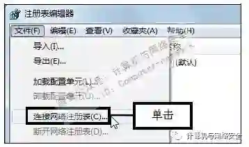 步骤2:单击“连接网络注册表”命令,打开“注册表编辑器”窗口,在菜单栏依次单击“文件>连接网络注册表”命令。