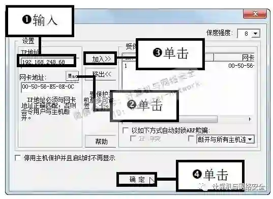 步骤18:设置要保护的主机,弹出“主机保护”对话框,输入要保护主机的IP地址,单击Mac按钮生成网卡地址,单击“加入”按钮,单击“确定”按钮。