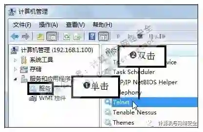 步骤6:双击Telnet选项,在“计算机管理”窗口的左边窗格中依次单击“服务和应用程序>服务”选项,然后在右侧双击Telnet选项。