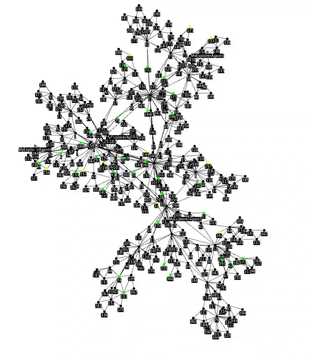 这是一个简单的多智能体问题。让 n 个智能体在完全连接的图上移动并收集宝藏。智能体的行动、感知和沟通受到限制,它们只能观察并移动到与它们直接相连的节点,只能与足够接近的智能体进行通信。
