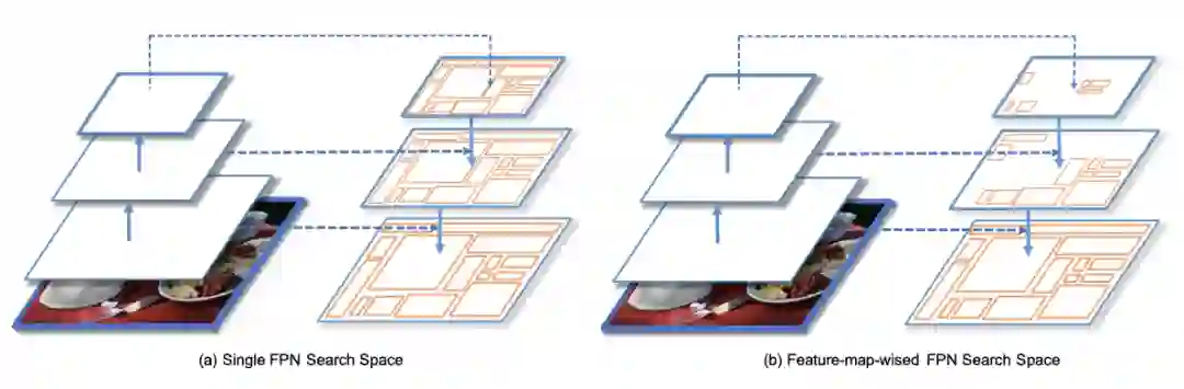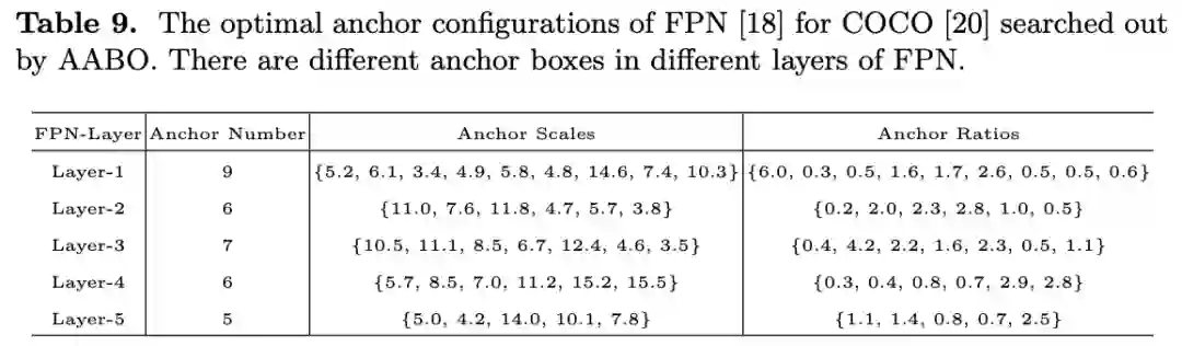 基于上面的分析,论文设计了自适应FPN的搜索空间,图4中的5个红框与上下界之间的区域即为FPN每层对应的搜索空间。具体搜索如上图所示,每层都有独立的搜索空间,层数越大,anchor的数量、尺寸范围和长宽比范围越小。实际上,与图4的黑矩形框搜索空间对比,这种自适应FPN搜索空间更大,而且每层较小的搜索空间有助于HPO算法的更集中地进行搜索。