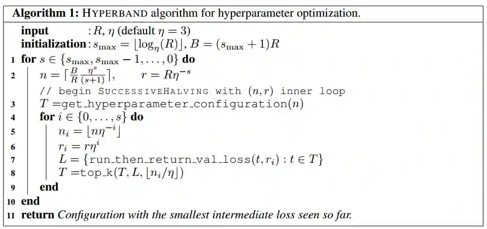 Bandit-based方法在限定资源的情况以高效的策略寻找最优超参数,资源可为时间、迭代次数等,而Hyperband是经典的bandit-based方法。Hyperband在Successive Halving算法的基础上进行了扩展,每次选取一批超参数进行多轮迭代,每轮迭代将资源
