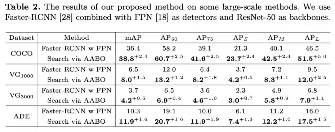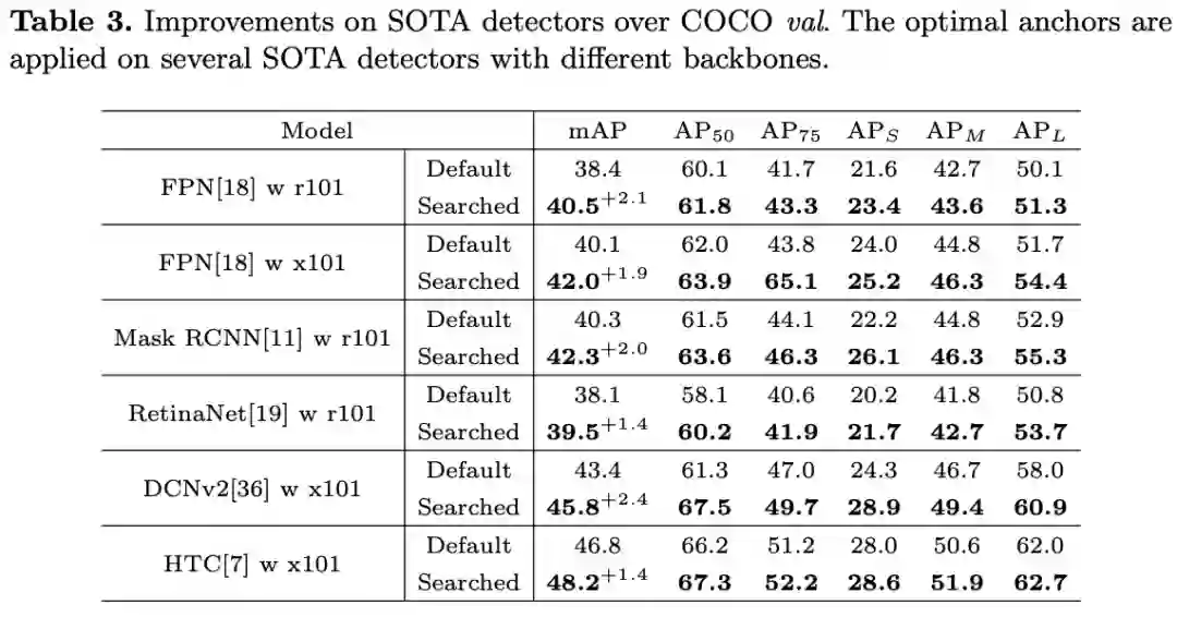 论文提出超参数优化方法AABO,该方法核心基于贝叶斯优化和Sub-Sample方法,能够自适应的搜索最优的anchor设置。从实验结果来看,AABO能够仅通过anchor设置优化,为SOTA目标检测方法带来1.4%~2.4%的性能提升。