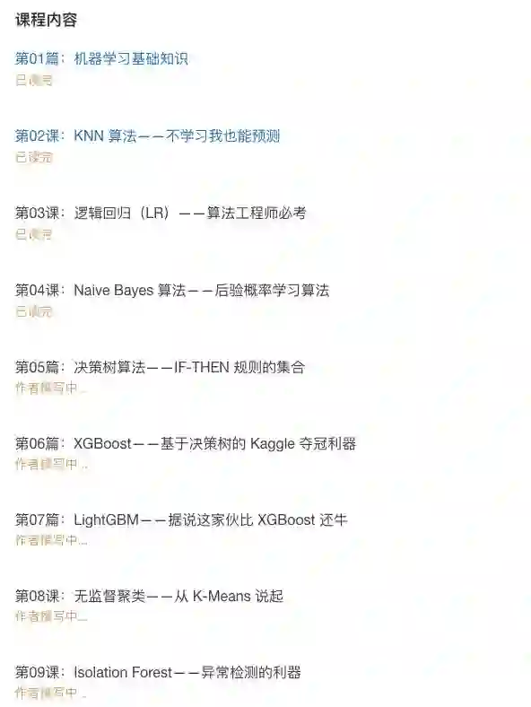 那么接下来就是本文最关键的地方:经典机器学习算法的学习,本课程是读者结合自己多年学习与工作经验挑选出的最具有实践意义的常用核心机器学习算法。