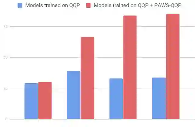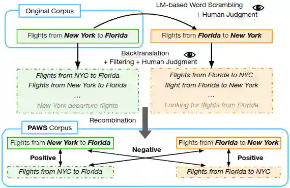 在 “PAWS:Paraphrase Adversaries from Word Scrambling” 中,我们介绍了一种生成句对的工作流程,可生成单词高度重叠,但释义对和非释义对的数量大约各占一半的句对。