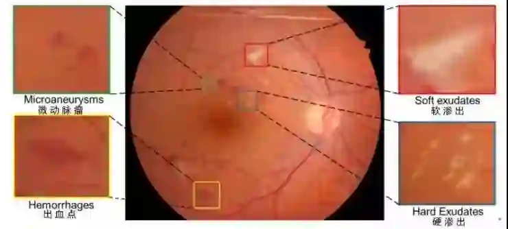 由视网膜毛细血管局部扩张而形成的微动脉瘤(MA)是糖网病最早期的病状,在眼底图像中一般表现为细微红点,随之出现的出血点(HE)、硬渗出(EX)与软渗出(SE)往往表明了糖网病的不同严重程度。因此,准确检测出视网膜病灶,特别是微动脉瘤(MA),对糖网病的早期诊断与治疗具有重要意义。病灶分割比赛的目标便是要检测出上述四种病灶的位置,并提取出病灶的准确边界。