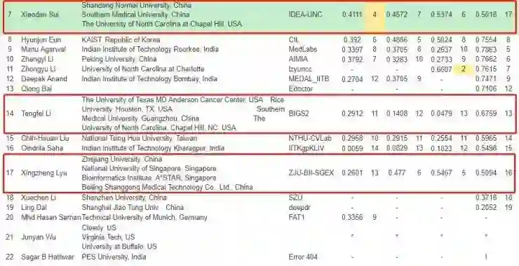 同时,国内学术机构也与国外顶级医疗机构合作开发相关的疾病算法。据 AI 科技评论了解,在这份表单上,山东师范大学和南方医科大学以及北卡罗来纳大学教堂山分校进行合作;南方医科大学与休斯顿的 MD 安德森癌症中心牵手;浙江大学与新加坡国立大学、新加坡生物信息学研究所以及北京上工医信公司等合作,这些医工结合的团队在竞赛中的表现也不俗。