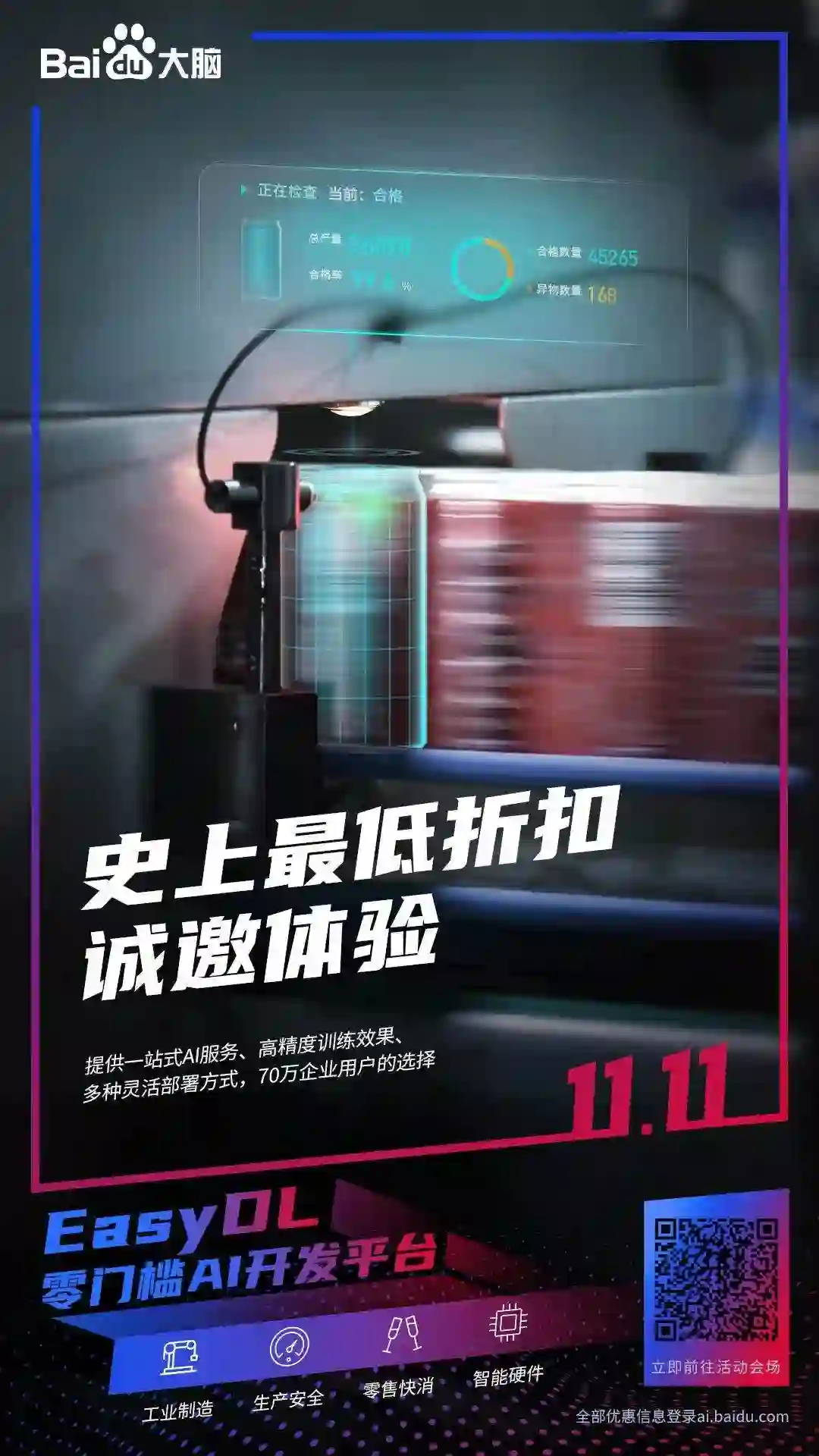 百度大脑EasyDL零门槛AI开放平台,提供一站式AI服务、高精度训练效果、多种灵活部署方式,不仅赋能工业制造领域,在生产安全、零售快消、智能硬件等领域也有广泛应用,目前已超过70万企业用户利用EasyDL平台落地AI应用。
