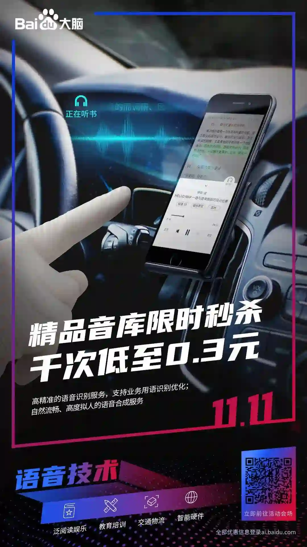 百度大脑语音识别技术采用领先国际的流式端到端语音语言一体化建模方法识别,提供高度拟人的语音合成服务。应用场景丰富,覆盖泛阅读娱乐、教育培训、交通物流、智能硬件领域,让语音大有所为。