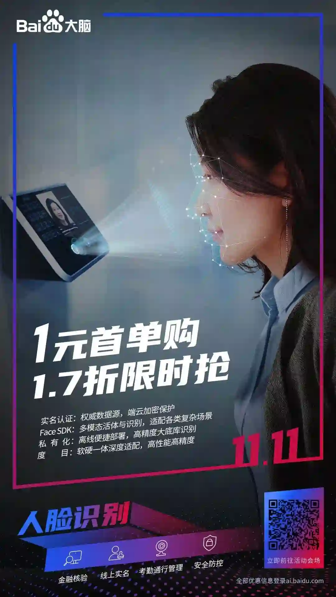 百度大脑人脸识别技术系列产品1.7折限时抢购,实名认证首单一元购,适用于金融核验、线上实名认证、考勤通行管理、安全防控等场景。