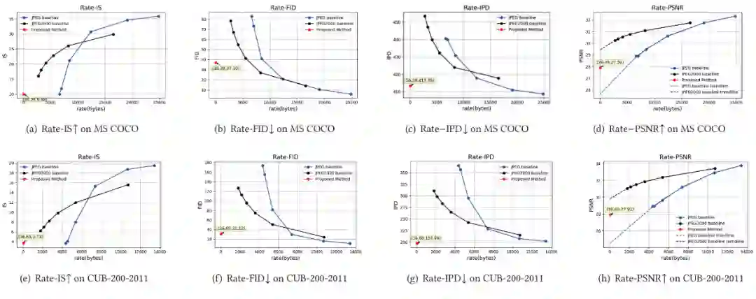 实验在文本到图像翻译的常用数据集MS COCO[11]和CUB-200[10]上进行。同时使用了四种不同层次的评价指标来评估模型的性能。使用感知得分(Inception Score, IS)评估生成图像在特征空间中的分布以及其边缘分布的距离来评估生成图像的真实性和多样性,其次是Fréchet起始距离(Fréchet Inception Distance, FID)通过评估生成图像和真实图像在特征分布上的距离,来评估生成图像和真实图像的相似度。同时,为了评估样本级别的相似性,本文还提出使用样例感知距离(Instance Perceptual Distance)来度量合成样本和真实样本在特征空间的距离,从而评估两者在样本级别的相似性。除了以上三个,实验中还报告了传统图像/视频压缩中信号层面的误差。