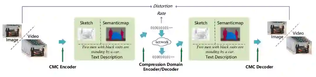 跨模态压缩将高语义冗余的数据(例如图像,视频等)压缩到一个语义紧凑的、通用的、人可理解的压缩域中(例如文本,语义图,素描图等)。它具有如下特点:(1)可以在满足一定语义保真的前提下实现超高的压缩率;(2)这种通用的紧凑表示可以用于多种分析任务,而不需要将原始数据重构出来;(3)这种紧凑的表示是人可理解的,所以可以直接用于语义监督;(4)在有必要的时候,可以结合生成模型从压缩域将原始的图像或视频重构出来。
