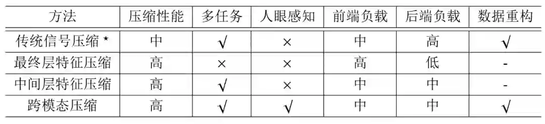 跨模态压缩与传统的图像/视频压缩框架是基于块的混合编码框架,最终层特征压缩(Ultimate Feature Compression),中间层特征压缩(Intermedia Feature Compression)等之间的不同特点如表1所示。