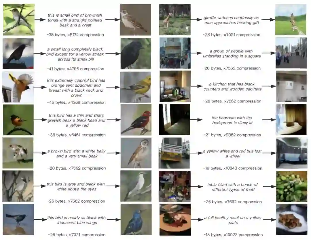 本节介绍跨模态压缩的一种具体实现:图像-文本-图像的跨模态压缩框架,如图3所示。借助于图像到文本翻译在近期的进展,理解一幅图像并用合乎语法的文本描述出来已经可以实现。同时,近期在文本到图像的翻译上的相关工作,也使得从文本中合成语义一致的图像逐渐成为可能。在跨模态压缩的实现中,通过定义压缩域